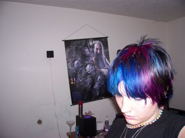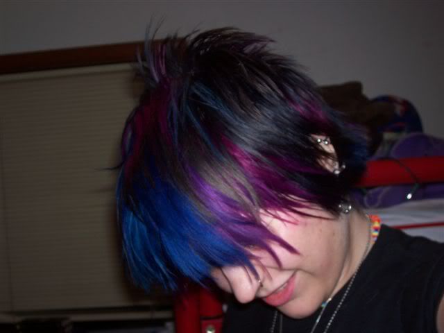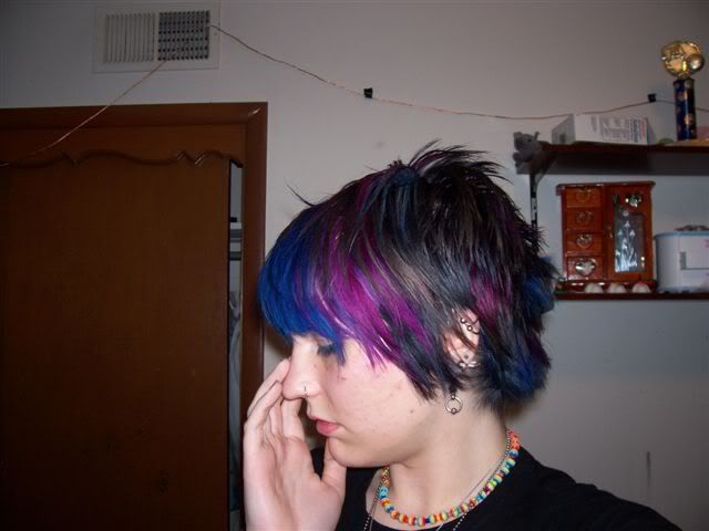 this is right after that picture when i cut it... i am doing these way out of order but i'm just adding them as i find them. for this style, i had a blue-black base with lots of coloured chucks spread throughout. my idea was like a blue rainbow with lots of shades of blue as well as pinks and purples. i did touch up a couple of spots after these pictures were done. these pictures sorta show the colours well: