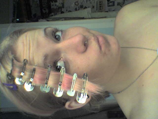 And then in between them you use a finger and just rub hair dye in gently, and it usually looks all weird and spotty but then i take out the clips and touch it up some, andd this time i did two colors!