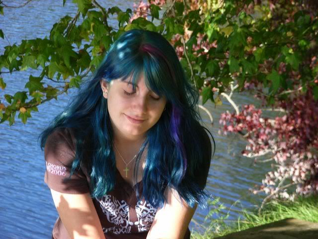I've been dying my hair mad colours since I was about 13, my favourite ever being bright blue - I adore my hair blue, I want it blue forever and ever all the time...but as the only blue dye you can get here is manic panic (which looks fab but fades fast), I have often found it too expensive to maintain. And then, the crushing blow - I was happily blue headed while studying then was told on no uncertain terms that it didn't look professional and I might damage my reputation as an interpreter etc so I have sadly gone back to my natural boring dark blonde. But it's my 21st birthday, AND I WANT BLUE HAIR so I'm getting the colourist to do it mainly dark brown and put big chunky highlights of blue all the way through it. SO EXCITED!