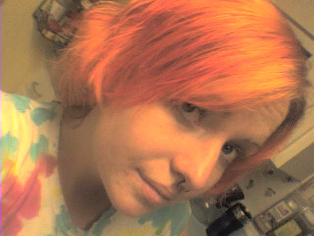 I dyed it tonight though. Its orange, i was just going to do streaks but then i started putting in yellow/red/pink/orange all over so its kind of multicolored but it all blends together. Heres a crappy cell phone picture of it.