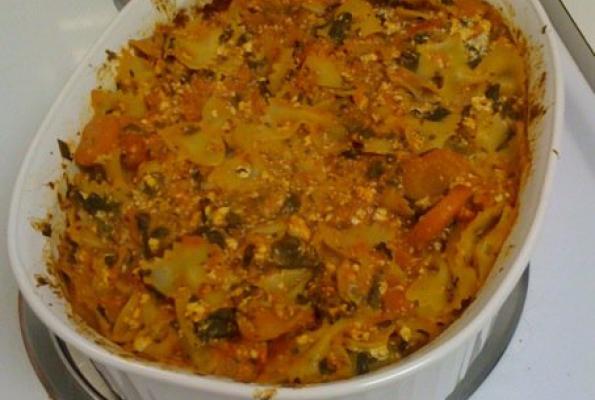 3. Place 3 lasagna noodles in bottom of an 11" x 7" baking dish. Spread tofu mixture over top, place 3 noodles on top of that, and spread tomato sauce and spinach on top of those. Repeat process until all noodles are used up. Top with spaghetti sauce.