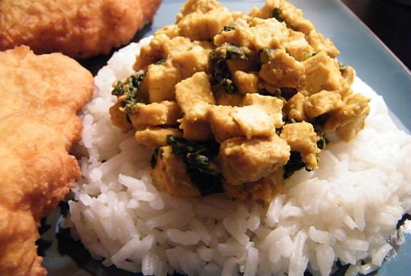 3. In the newly available skillet space, add more oil (if necessary) and curry. Add spinach and mix well with curry/oil. Stir-fry spinach and curry until spinach is cooked through. Stir-fry spinach and tofu together until mixed evenly.