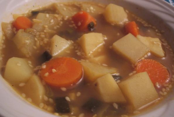 This soup is quite tasty. Def a great recipe for cold, wet weather. I used rice and, now that I've eaten some, I think it would be yummier with noodles and I would up the carrot content 'cause I found the amount of potato a bit much for me.