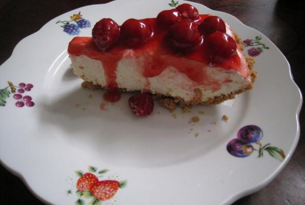 Ok, so the recipe I used is slightly different . I used 2 containers of tofutti cream cheese, 1 large package of frozen whipped (soyatoo I think is the brand), some powdered sugar (I would guess at least a cup-- I don't measure, I just sprinkle from the box, mix and taste test), some vanilla extract (1 - 2 tbs), a pre-made graham cracker crust from baking aisle of supermarket (vegan too!) and 1 can of cherry pie topping/filling. I soften the cream cheese in the microwave for about 30 secs to a minute, whip with the whipped cream topping and then add the sugar. You could also used different sweeteners such as agave, etc. Add extract. Pour topping into pic crust. Add cherry topping. Put plastic pie cover on top of pie and let chill in fridge for as long as you can before your house folk attack it! lol This pie does NOT last long. LIke not even a day. It's that good!