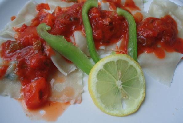 4. To serve, put 5 wonton ravioli on a plate, spoon as much tomato sauce as you want on top! Eat it!