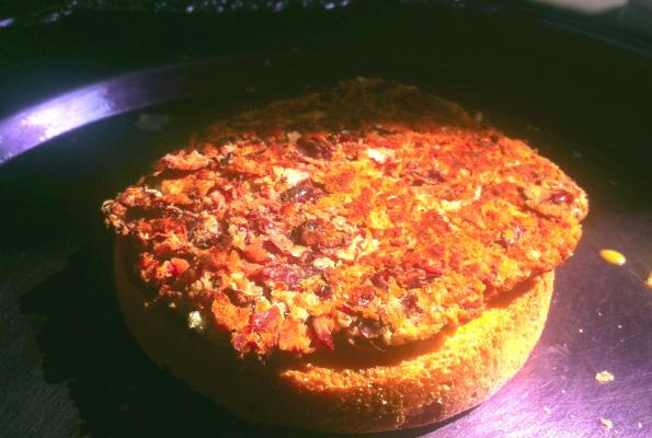 2. Put a large spoonful on a frying pan to form burger shapes. You have the option of sprinkling oil and breadcrumbs on the outside of the burgers.