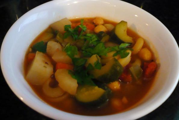 Excellent Recipe! I did make some changes.. I cut down the garbanzo beans to 1 can cause I dont care for them, no salt, and added 2 tablespoons or so balsamic vinegar, some red wine, tomato paste (ketchup!), and fresh spinach. This is now one of my favorite soup recipes!