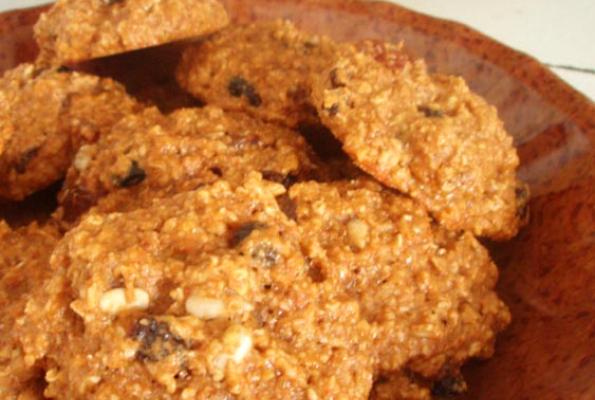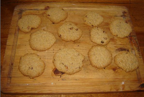 I'm not sure what I did wrong, because the picture accompanying this recipe means that *somebody* made the cookies just fine, but my cookies came out like rocks! I swapped out the cinnamon for ginger and the raisins for apricots, but was the only alteration I made. The dough was *extremely* crumbly, and I would recommend adding a small amount of water at the end to make it stick together better--I probably could have baked it spread out on aluminum foil and made granola. Which really doesn't sound like a bad idea.