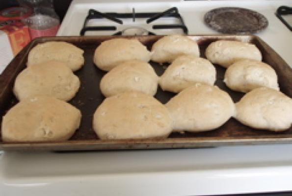 Plop spoonfuls of the dough onto a greased pan/ sheet, making about 12 rolls (or whatever you like). Bake for about 20 minutes, until the tops are browned.