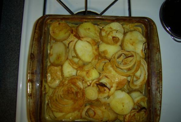 1. Preheat the oven to 450 degrees F. Prepare a casserole dish (I used an 8x8" glass pyrex) with oil to cover the bottom. Set aside. Add 1 layer of potatoes to the bottom of the dish (I used 2 potatoes per layer, for 3 layers).