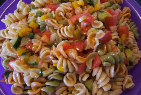 My husband LOVES this pasta salad. It is simple to make and is very tasty. I agree that it is a bit on the sweet side, so I've been adding half the sugar. I just included the whole pepper and cucumber, as it fills the salad better. You could totally experiment with different veggies for different textures; and add a favorite bean (I used white) for some protein. Fantastic recipe! Thanks!!