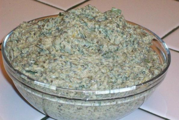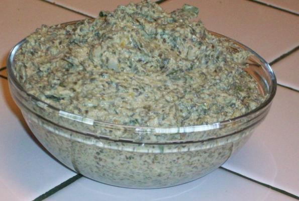 ~ In a food processor/ blender, puree garlic, tofu, leek soup mix, lemon juice and spinach. (Just dump it all in and blend it to a cream.)