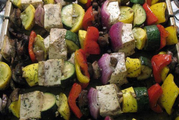 2. Cover and place in the refrigerator, allowing to marinate 8 hours, or overnight. Preheat oven to broil. Thread the marinated vegetables onto metal skewers.