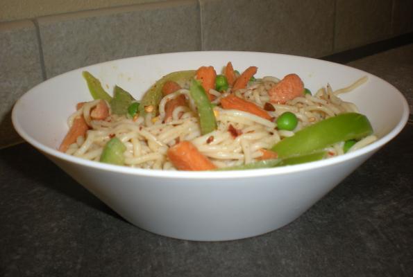 2) Microwave the cashew butter for about one minute or until runny. Whisk in sesame oil, soy sauce, and vinegar. Toss with noodles, red pepper flakes, and any veggies you like (I used peas, green bell pepper, and carrots). Garnish with sesame seeds.
