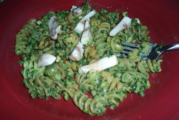 this was delicious. I used spinach pasta and the flavor of the pesto went excellent with it. I make this weekly :)