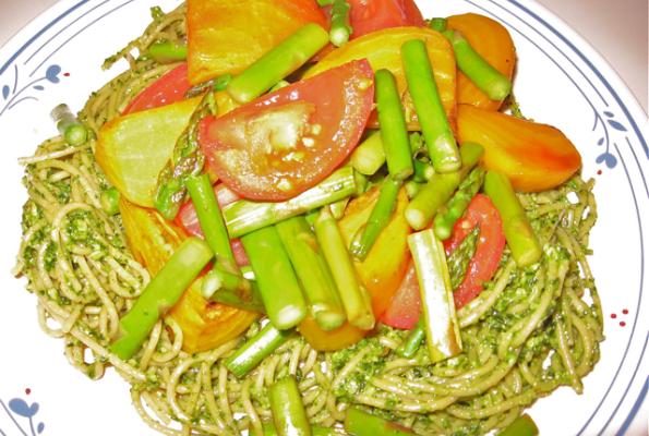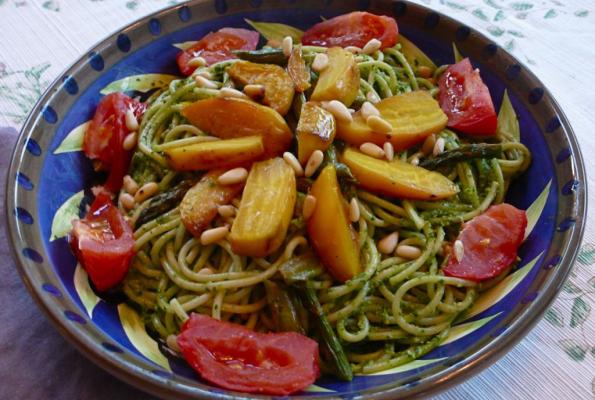 This would be great with all sorts of roasted vegetables, I used what I had on hand: beets, asparagus, and tomatoes. Other good things would be red peppers, garlic cloves, red onion, broccoli, eggplant, fennel, or zucchini. Go wild! To be honest, the veggies were good, but the spinach pesto really stole the show!