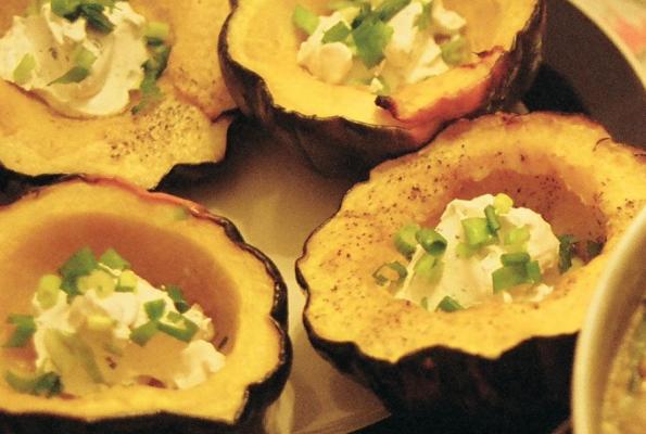 3. When they are out of the oven, let cool slightly and spoon the vegan cream cheese into the middle of the squash, and top with green onions.
