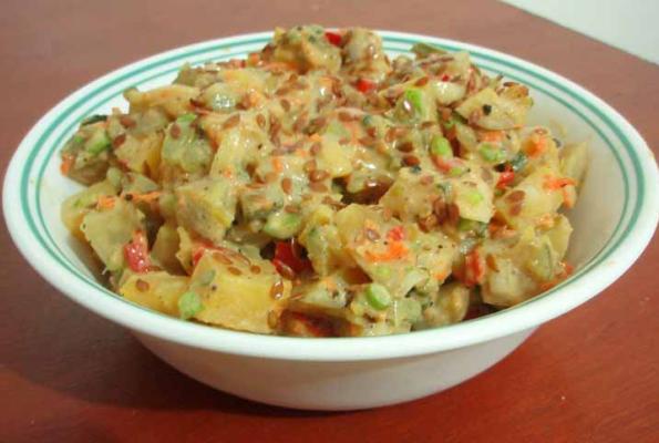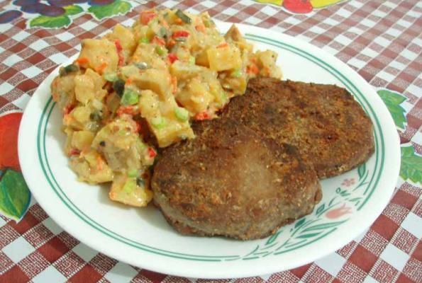 yum! i used relish instead of pickle juice, miso mayo mixed with mustard, and added a 1/2 tbsp each of minced red bell pepper, celery and shredded carrot.. the sweet potato makes this really good and a nice change.. i had it as a side with some floured and fried seitan steaks.. meat and potatoes - super yummy vegan style ;)
