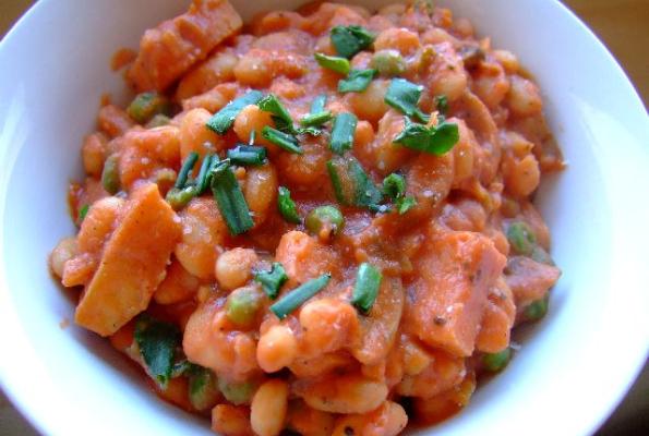 Well, I don't want to rate the recipe b/c I basically made something totally different..but it was fabulous! I forgot that I ran out of chick peas, so I decided to use great northern beans. I fried about a 1/4 block of cubed tofu for a couple minutes, added some mushrooms, fresh jalapeno, the beans, not a whole can of tomato paste, lime zest and juice, a little soy milk, organic green peas, and green onion. I used s, p, coriander, curry thai red, a dash of cinnamon, and basil. Yum! I ate the whole thing..