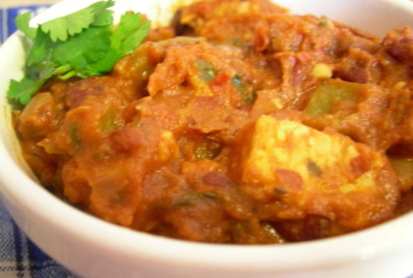 First, cube the tempeh and fry it in a little oil. Add the tomatoes, chilies, and spices once tempeh is a bit cooked (slightly crispy is good). Sautee until tomatoes are "reduced" (i.e. start to get thick from water cooking away).