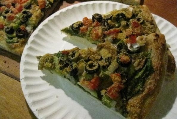 3) Finally, slice all pizza toppings to desired size. When the dough has completed rising, roll out on floured surface until about 16" across. Spread a layer of sauce up to the edges. Place a layer of spinach above the sauce followed by zucchini, mushrooms, onions, olives, and topped with tomatoes. Cover that with a generous layer of nutritional yeast Parmesan and bake at 440 degrees Fahrenheit for about 20 minutes or until the crust begins to turn golden brown.